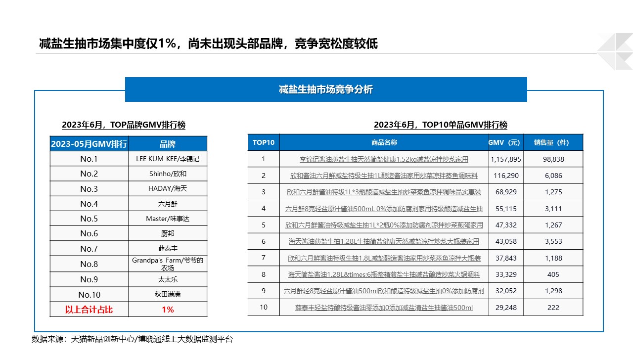 基于以上趋势,主要酱油头部品牌(如李锦记、海天等)纷纷布局“减盐酱油”细分赛道,目前市场集中度不高,竞争格局并未稳固,普通商家仍有机会参与此赛道。