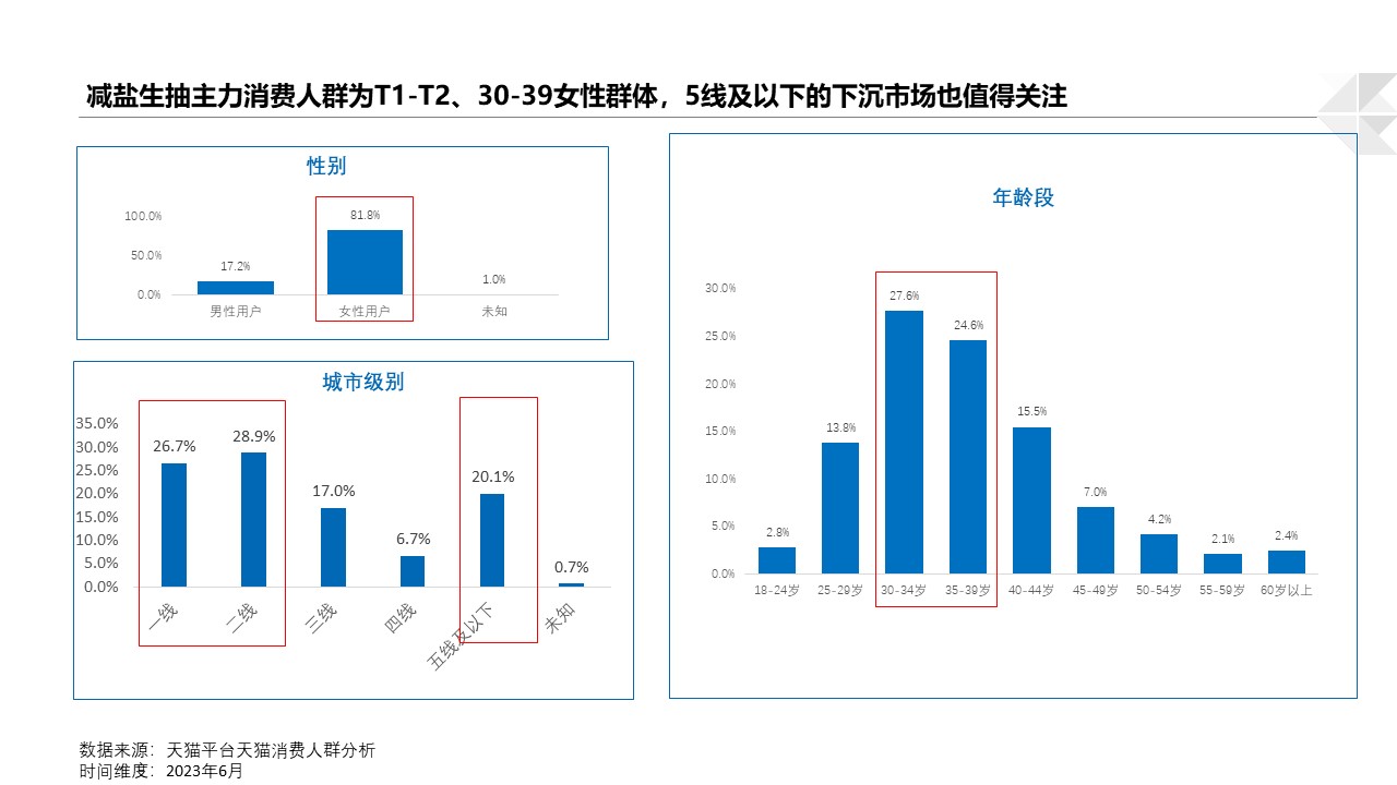减盐酱油的消费者人群特征:1-2线发达城市、30-39岁以下的女性群体,新品创新只需重点针对此类核心人群运营即可。