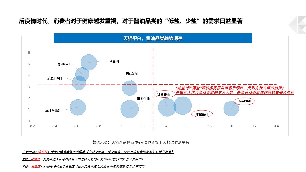 后疫情时代,消费者对于健康越发重视,对于酱油品类的“低盐、少盐”的需求日益显著。天猫先锋达人作为新品尝鲜的主力人群,是新兴品类发展趋势的风向标, “减盐酱油”受到此类人群的偏好,更加印证了目前消费者对于食品健康化的大消费趋势。